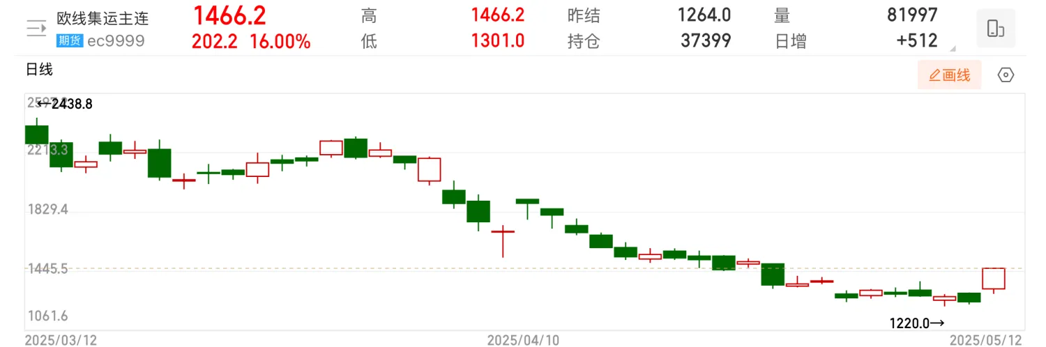 而最值得一提的是,今日尾盘集运欧线期货主连出现异动,尾盘急速拉升触发涨停,收盘涨16%。