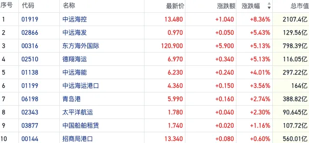 截至发稿,中远海控(01919.HK)大涨超8%,创下4月以来股价新高。中远海发(02866.HK)、东方海外国际(00316.HK)双双涨逾5%。德翔海运(02510.HK)、中远海能(01138.HK)等多家航运公司跟涨。